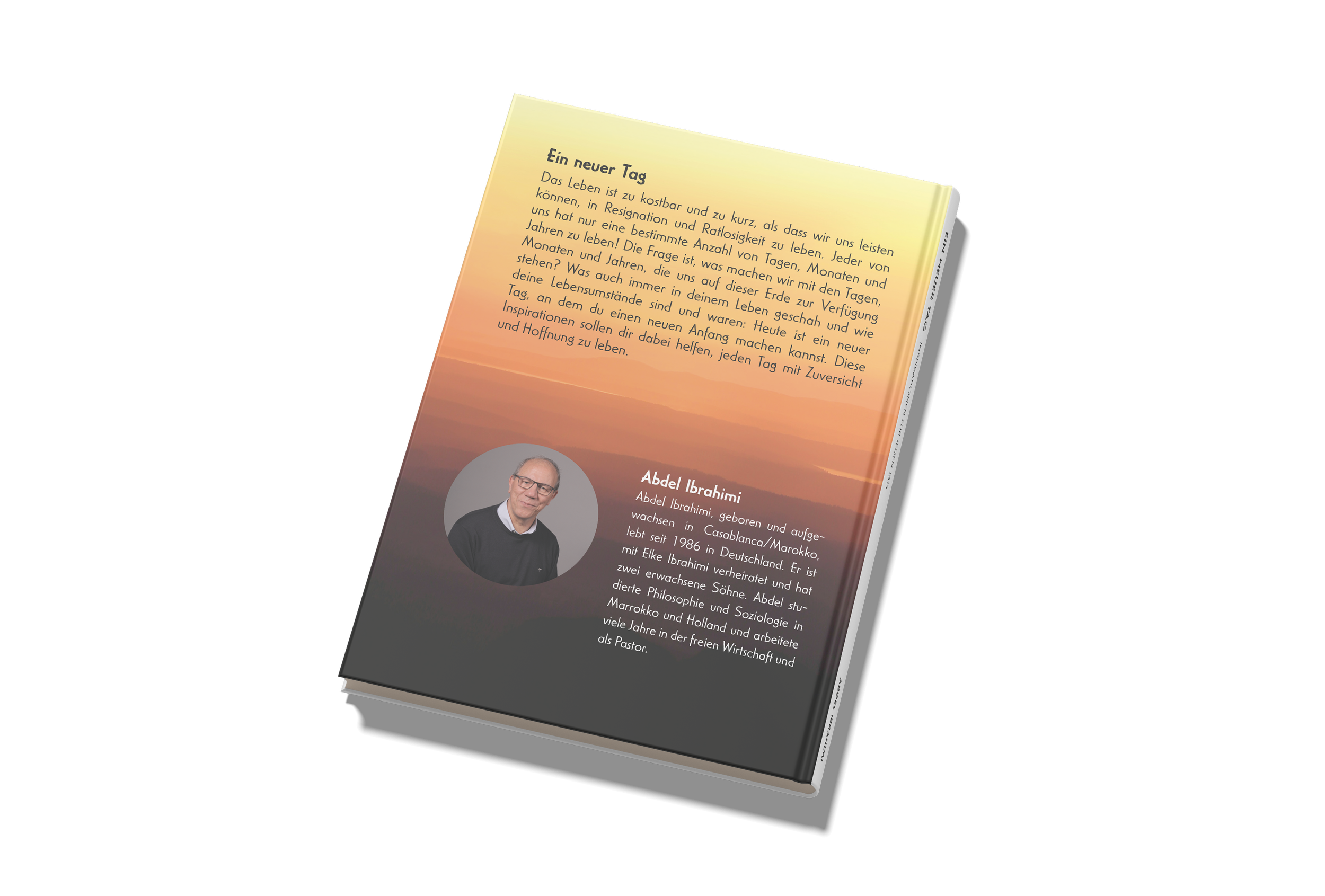 Das Buch „Ein neuer Tag“ ist das Debütwerk von Abdel Ibrahimi, Redner und Pastor im Ruhestand, und erschien 2022 über Amazon KDP. Im Jahr 2024 folgte die Veröffentlichung der zweiten Auflage, die mit einem frischen, überarbeiteten Design aufwartet – einen Look, den ich gestalten durfte. Es war eine besondere Freude, diesem inspirierenden Werk ein neues visuelles Erscheinungsbild zu verleihen.